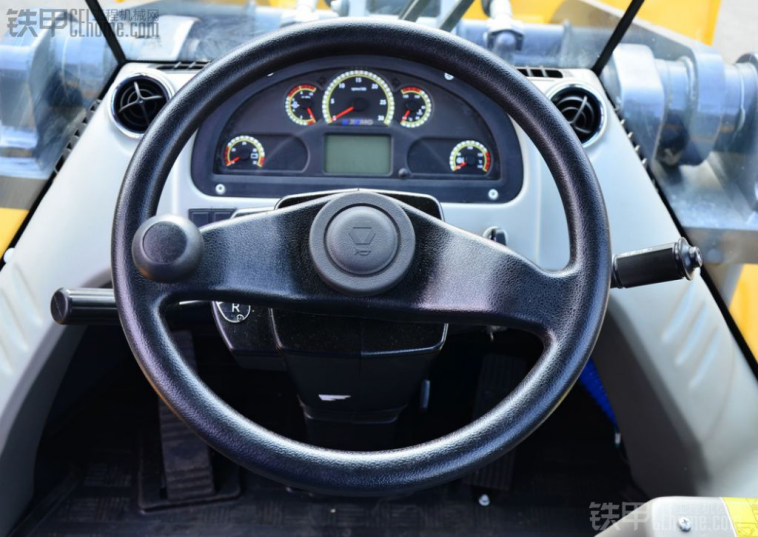 全景驾驶室不仅好看,视线宽阔,还能降低驾驶人员疲劳感。50GV驾驶室中控方向盘采用的是二幅式方向盘,这种方向在快速打方向的时候有一种很顺的感觉,以前的装载机不管什么装载机基本都是三幅方向,三幅方向用手抓那个圆的比较合适,当然这个是个人习惯问题。先导手柄的设计很好看,但是如果在先导装个喇叭按键也许会更好一些。甲友们觉得呢?