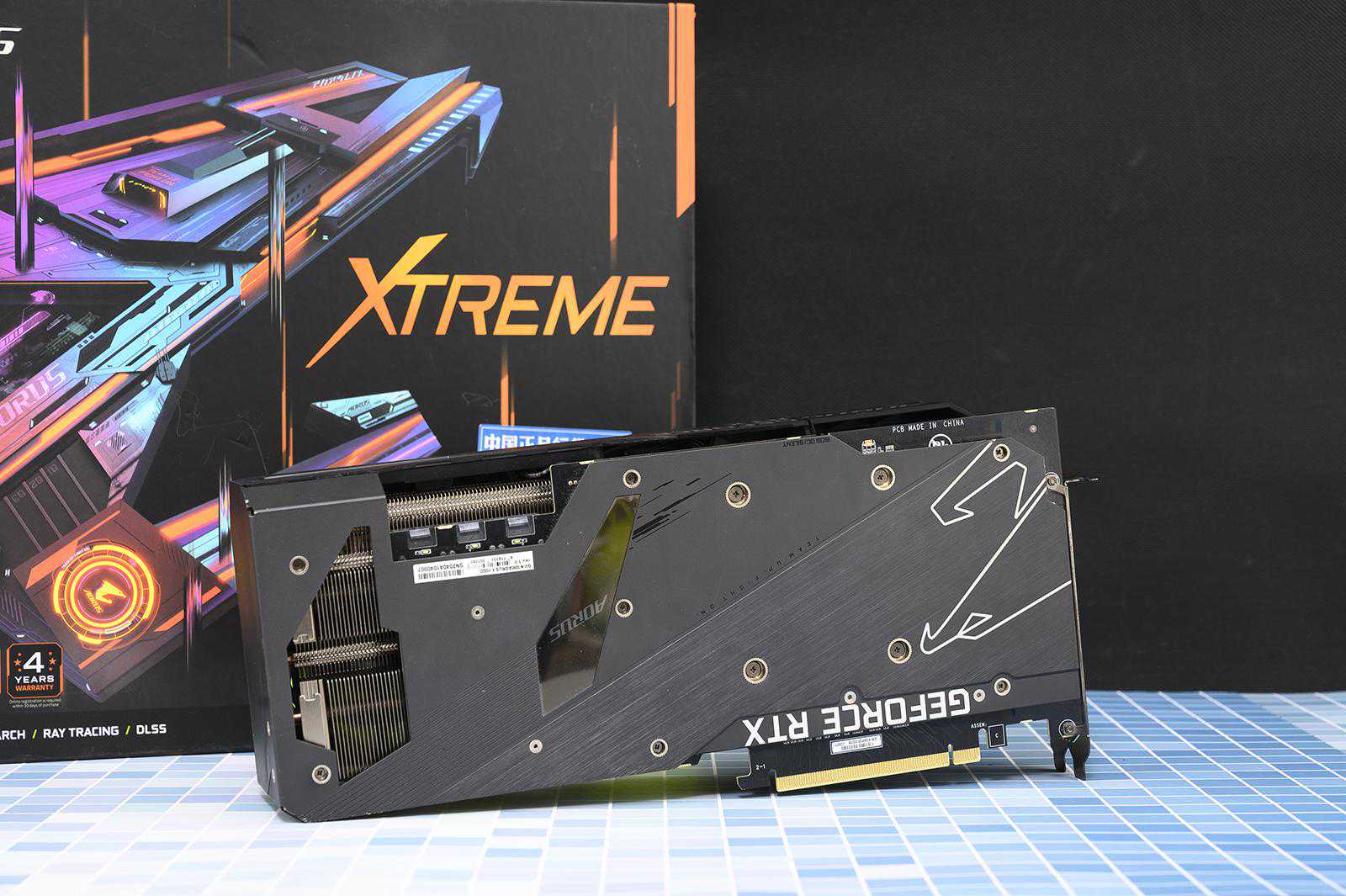 AORUSGeForceRTX3080XTREME大雕显卡配置有金属背板,不仅可以在视觉上营造高端大气上档次的感觉,而且还起到加固显卡PCB以及辅助散热的效果,这在高端显卡上已经是标准配置。同时金属背板并非是传统的平板式设计,而是在尾端打开了一个窗户,这个设计并非单纯为了视觉美观,此处的开窗可以使的最右侧风扇的风流直接贯穿散热器,让热量尽可能地散发到机箱内部并被机箱风扇带走,因此这样的设计同样是有利于加强显卡的散热。
