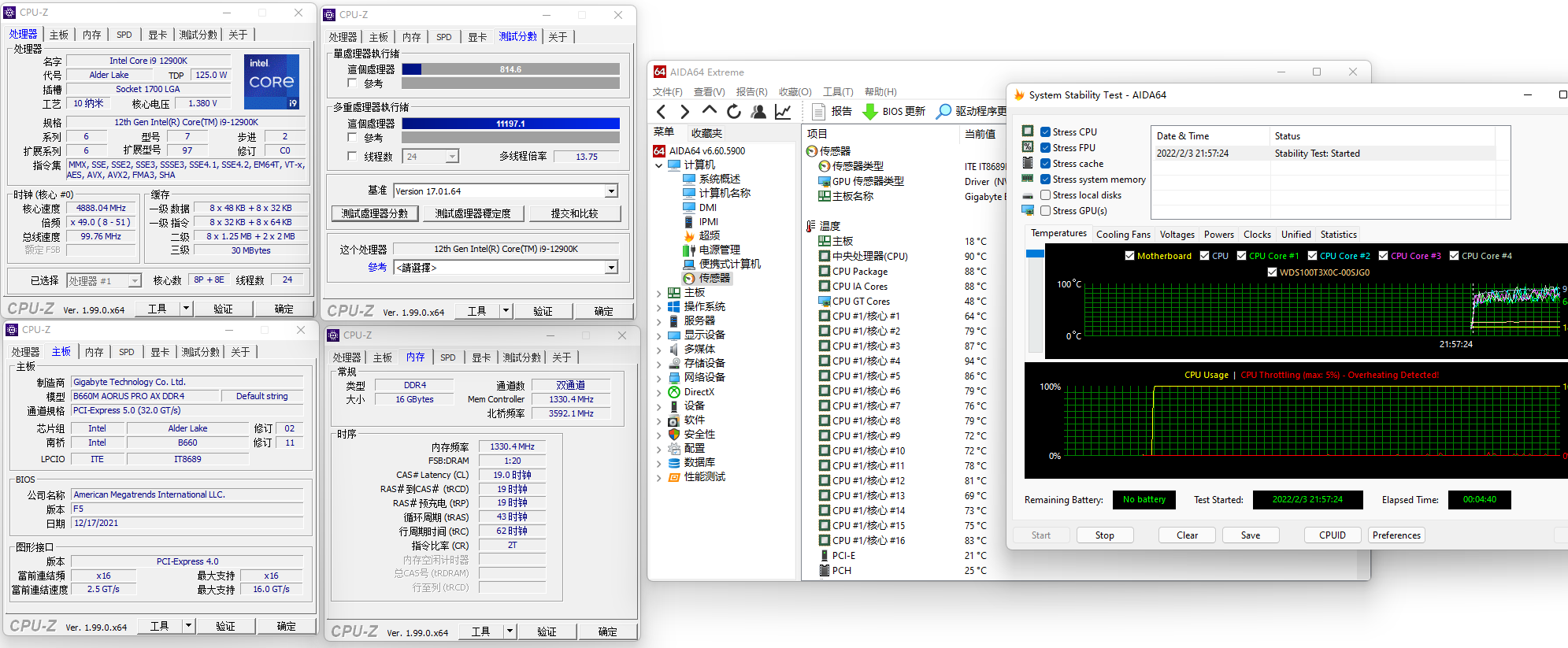 技嘉雪雕B660M,采用的是12+1+1相供电,供电充足,cpu自然就不会偷懒。而且,我用的超频3GI-CX360ARGB的上限是TDP350w功耗的处理器(需要超频才能实现),对付默认频率的i912900k简直完全不是问题。全程CPU满载,温度也不过88-90度左右,毫无压力。