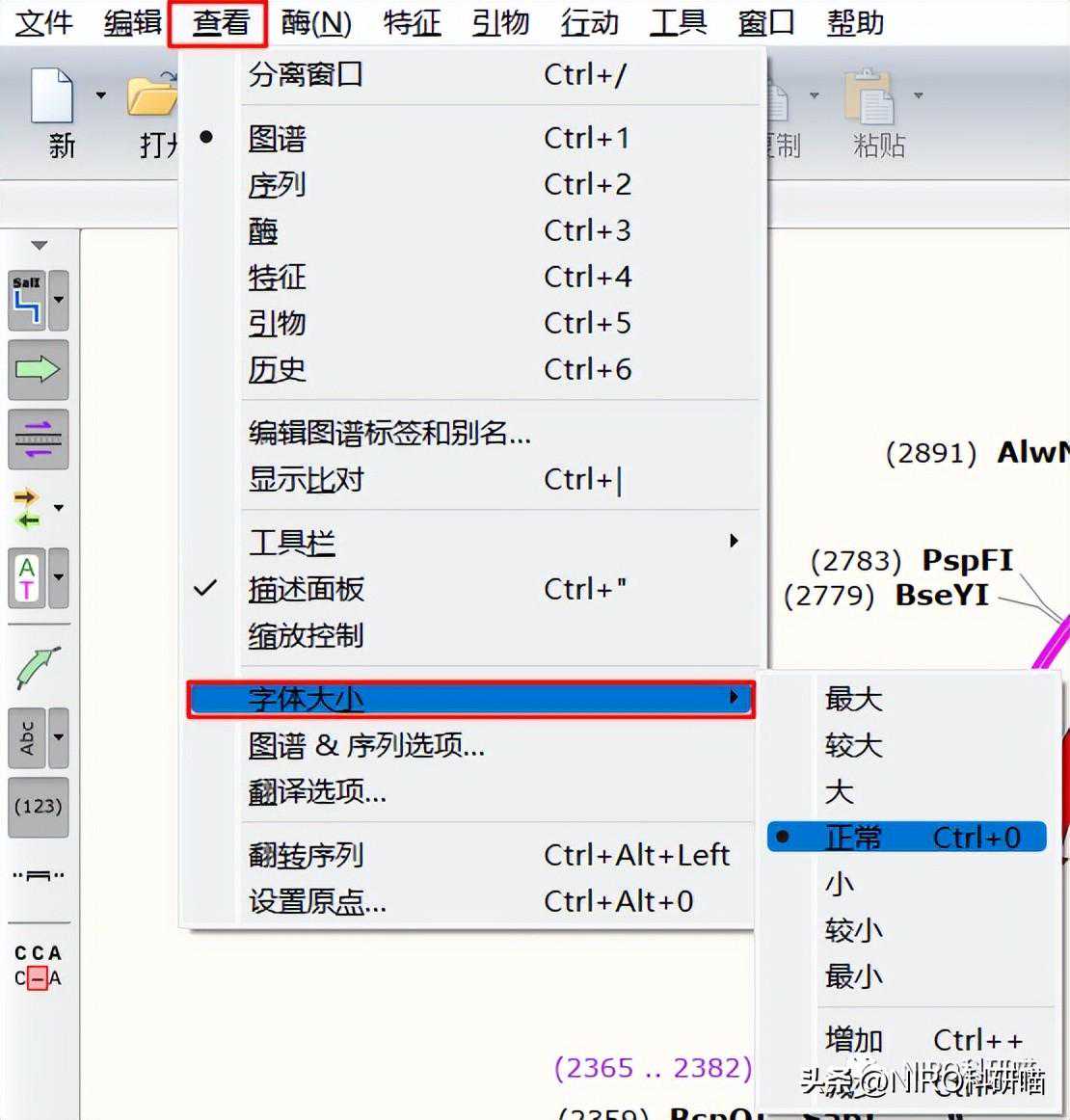 注:字号大小的修改会应用到SnapGene所有的文件,比如Map、序列、酶、引物、以及历史记录;字号大小会影响一些展示的宽度;如果SnapGene里的字号修改依然无法适配您的要求,请检查您电脑显示器分辨率的设置。