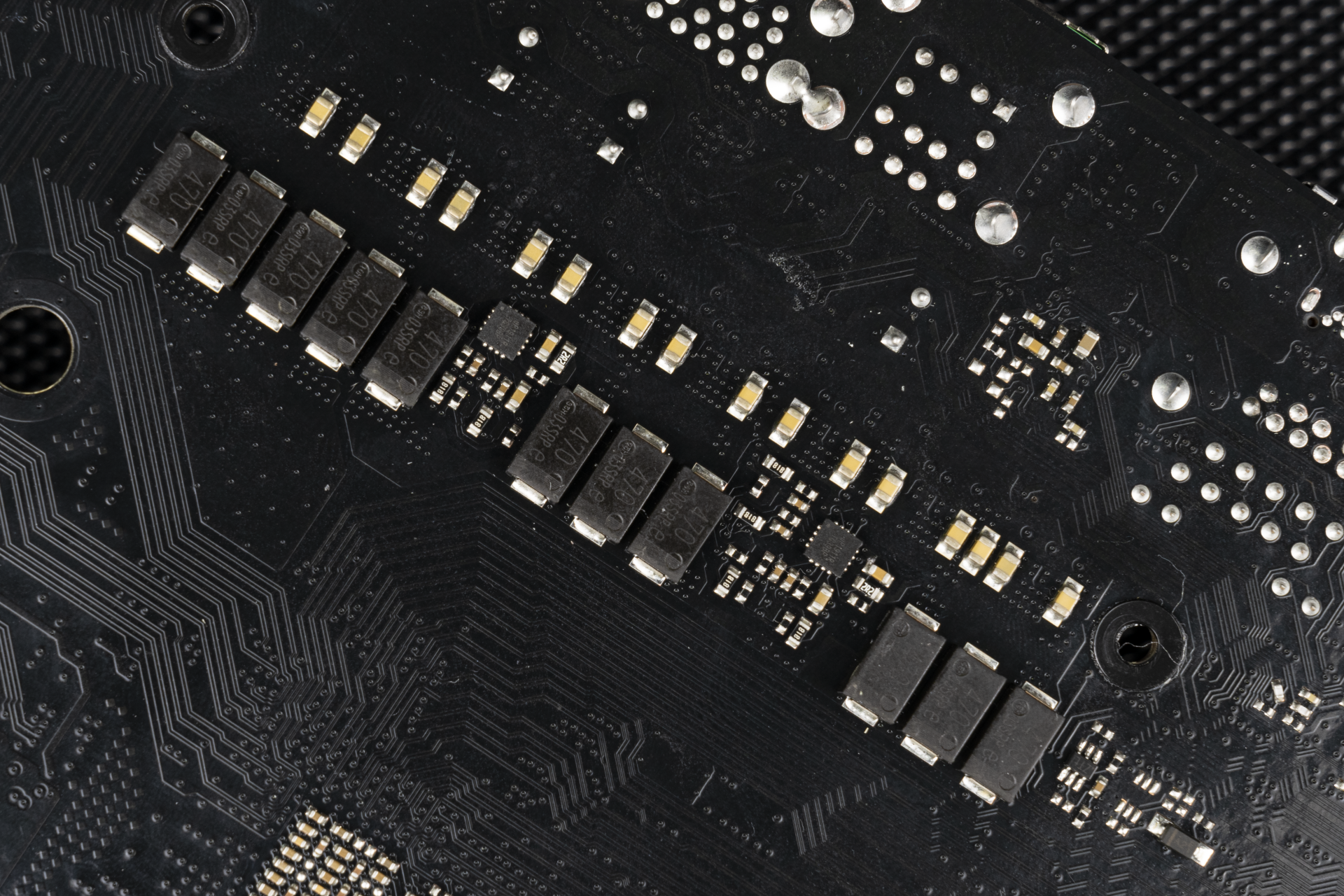 ▲首先是Core(核心)MOS,来自Vishay(威世)的SIC654,这是一颗SPSMOS,单相最高支持50A的供电电流,核心部分一共采用了六颗。