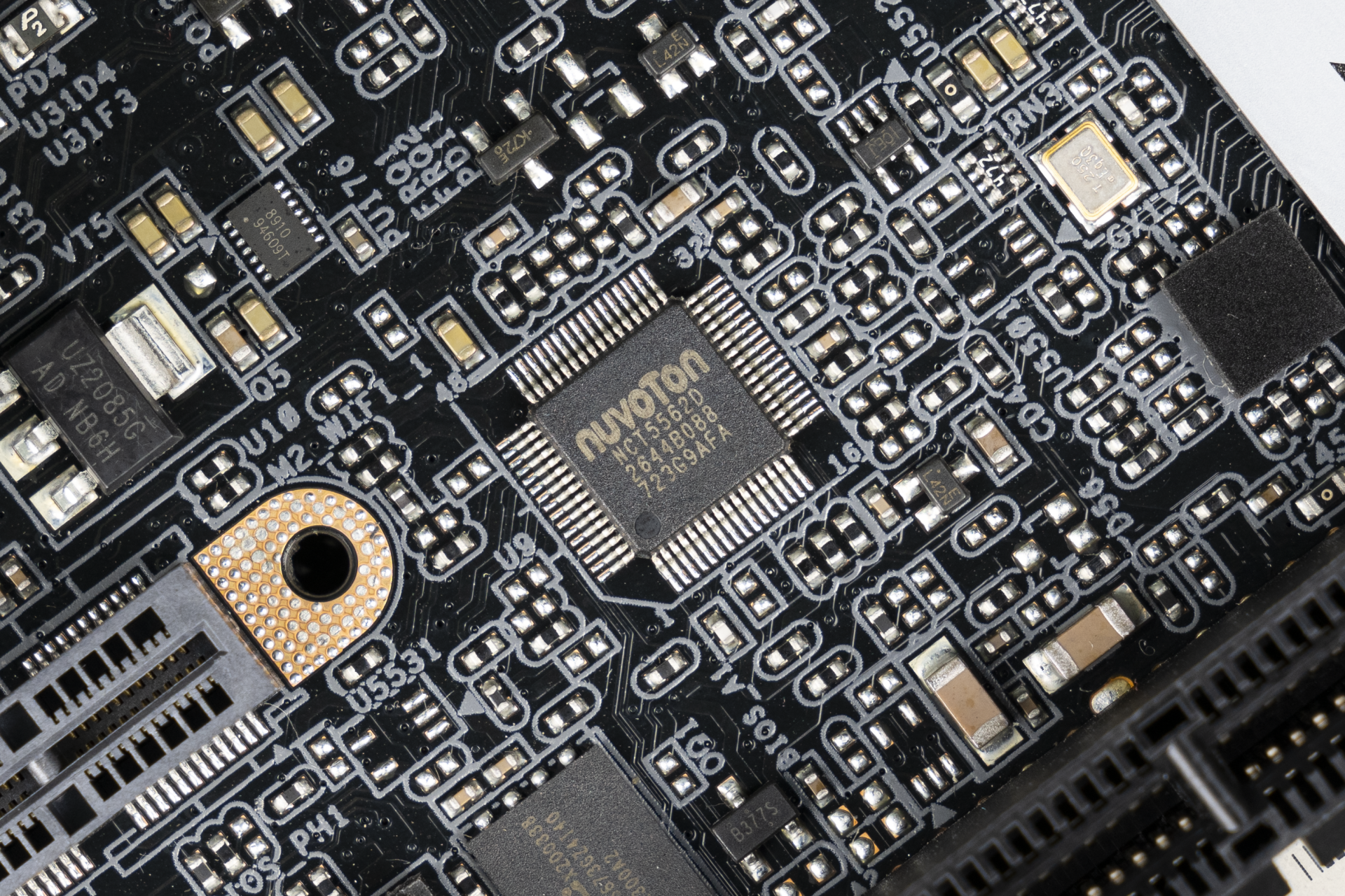 ▲来自Nuvoton(新唐)的NCT5562D,这是一颗SuperIO芯片,主要用于监控主板上各个硬件的温度、转速、电压等,监控的同时还提供了一些低速总线,比如SPI。