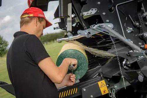 网子通过一个特别的加宽进入通道喂入到草捆外侧,如果需要也可以使用尺寸加宽的网子。