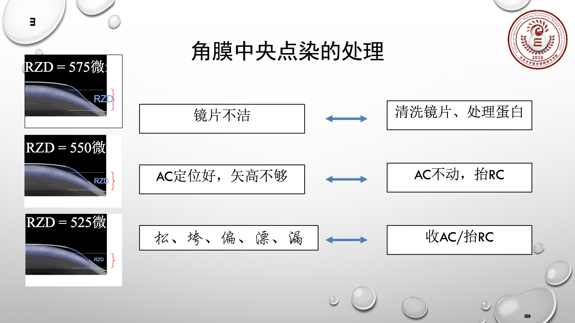 所以此情况需把RC抬起一档。只是把RC适当的增加,并不会太紧,留出镜片中央和角膜接触的空间,保证中央的角膜前面有泪水存在,也保证中央角膜的安全性。