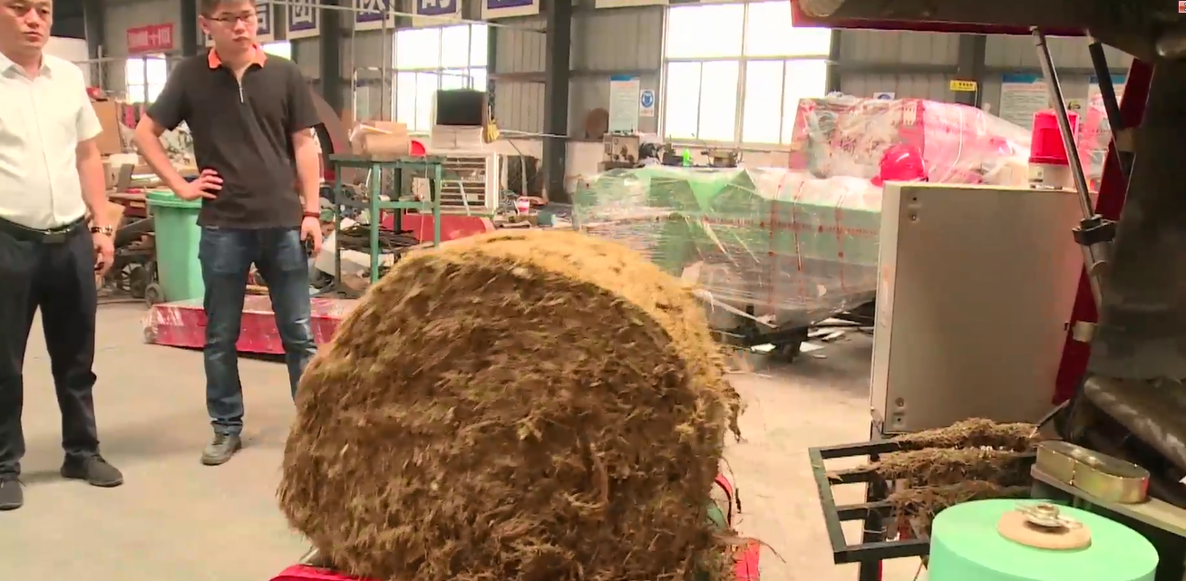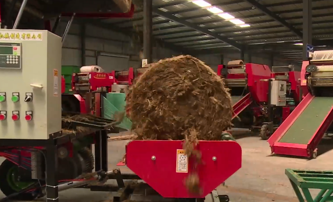 据发明人介绍,青贮饲料的营养价值要高,发酵过的青贮饲料有一种乳酸菌,同时能促进牛羊的胃更好的消化,所以牛羊比较爱吃。这台揉丝机可以把整颗的玉米秸秆,进行前期的粉碎揉丝,再通过这个输送带上料,然后经过打捆机逐层压实,把秸秆打成圆捆。