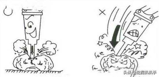 在破碎锤工作之前,将钢钎垂直放置在破碎物上,确认钢钎稳定后再开启破碎锤。在破碎作业中也要随时保证钢钎垂直于被击打物体;如果与击打面倾斜,钢钎有可能滑偏,会损坏破碎锤的钢钎和活塞。