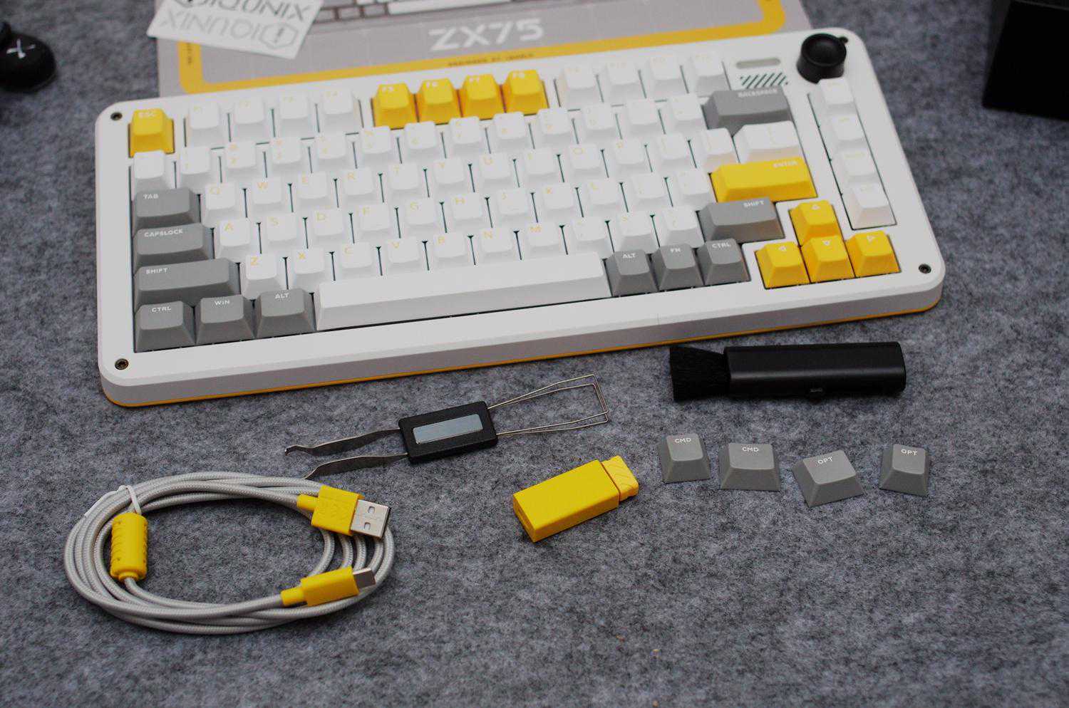 全家福:键盘主体、MAC替换按键、毛刷,二合一拔键拔轴体器,USB接收器,说明书,贴纸,U-C口线缆。