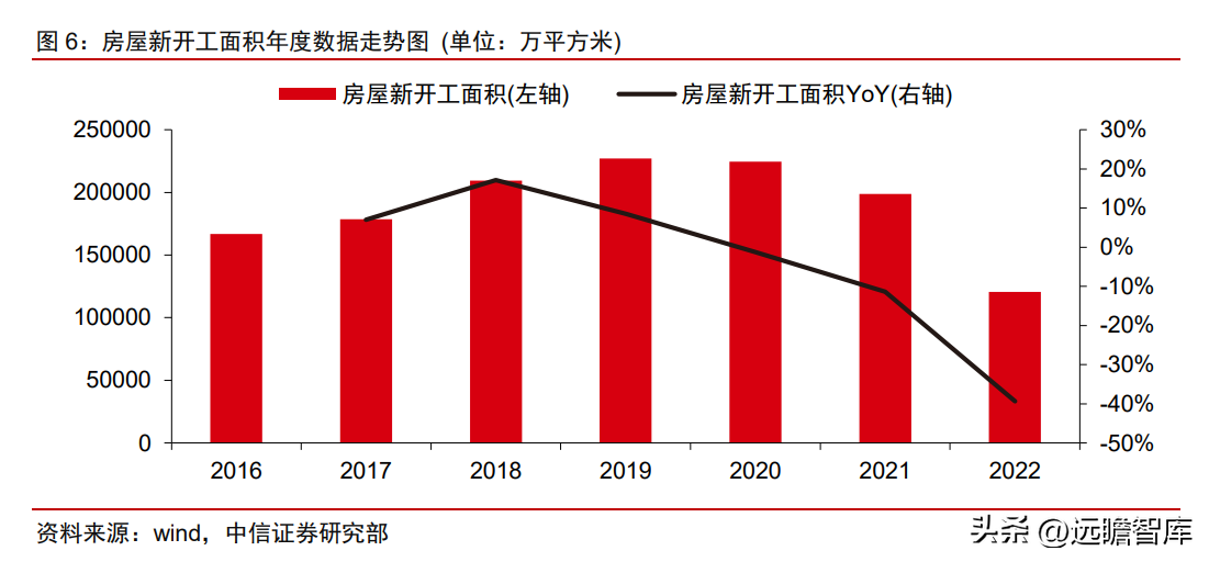 未来随着地产相关政策的不断松绑,跟2022年相比,预计2023年地产新开工面积同比有望改善;中信证券研究部地产组的预测2023年地产新开工面积将同比持平。