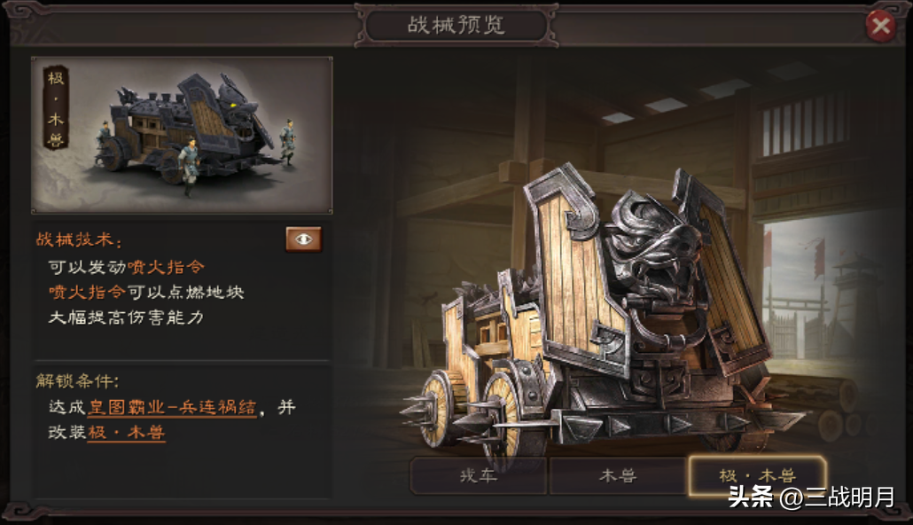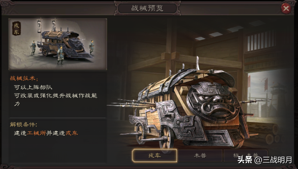 戎车,战车像武将一样,可以开兵书,主要优势就是在打架的时候提供增益,如下图。