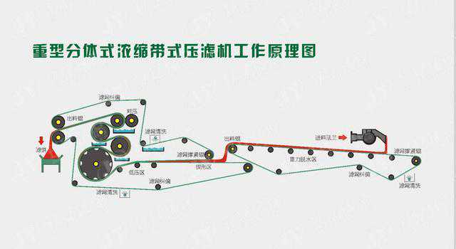 污泥经输送泵进入动(静)态混合器,与同时加入的浓度为0.05~0.1%阴(阳)离子絮凝剂溶液相混合并充分反应后,渣(泥)浆中的微小固体颗粒(或悬浮物)聚凝成体积较大的絮状团块,物料间的结合水及表面水被分离成自由水,当物料被输送铺展到加长的重力预脱水区的滤网上,在重力的作用下自由水透过滤网背面而渗出分离,形成不流动状态的污泥,达到压榨脱水区实施最大压力条件,然后随着网带的移动而夹持在上下两条网带之间,经过具有可调张紧力的过滤带及直径逐渐递减的转辊和对压辊,实施连续增加的缓慢的对辊挤压力、剪切力作用,通过楔形区、低压区、中压区、高压区和强力对辊挤夹区将渣(泥)浆中的水份经过逐级增压的方式不断挤压出来,最后形成含水率较低的滤饼排出,通过刮料板刮离,上下滤带分开,经过高压冲洗水及滚刷清除滤网表面孔隙中的微量颗粒,继续进入下一步脱水循环。