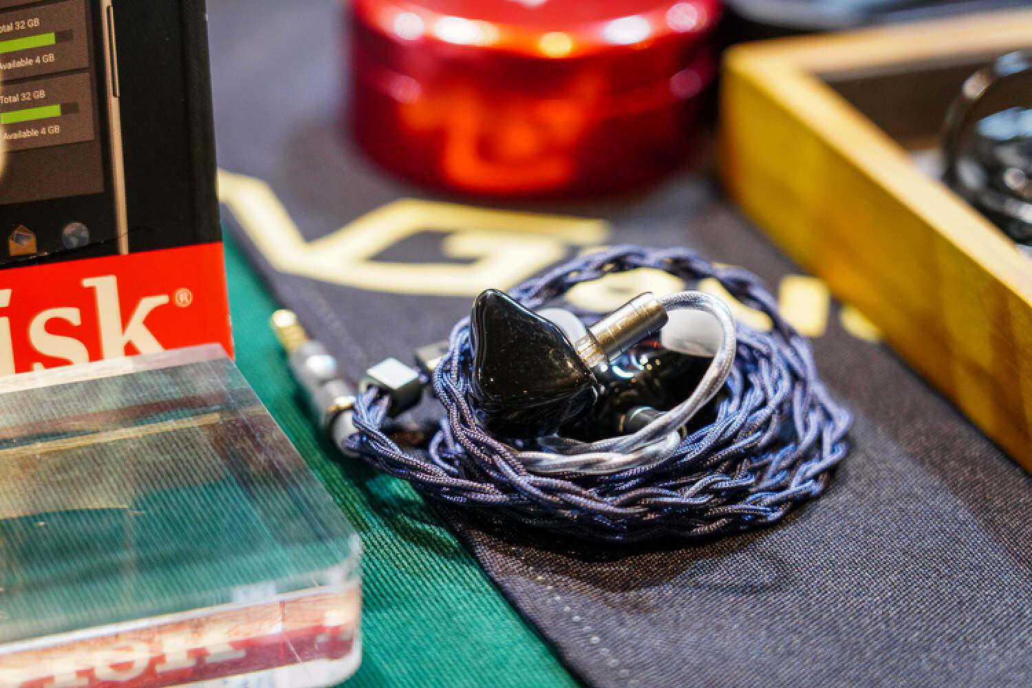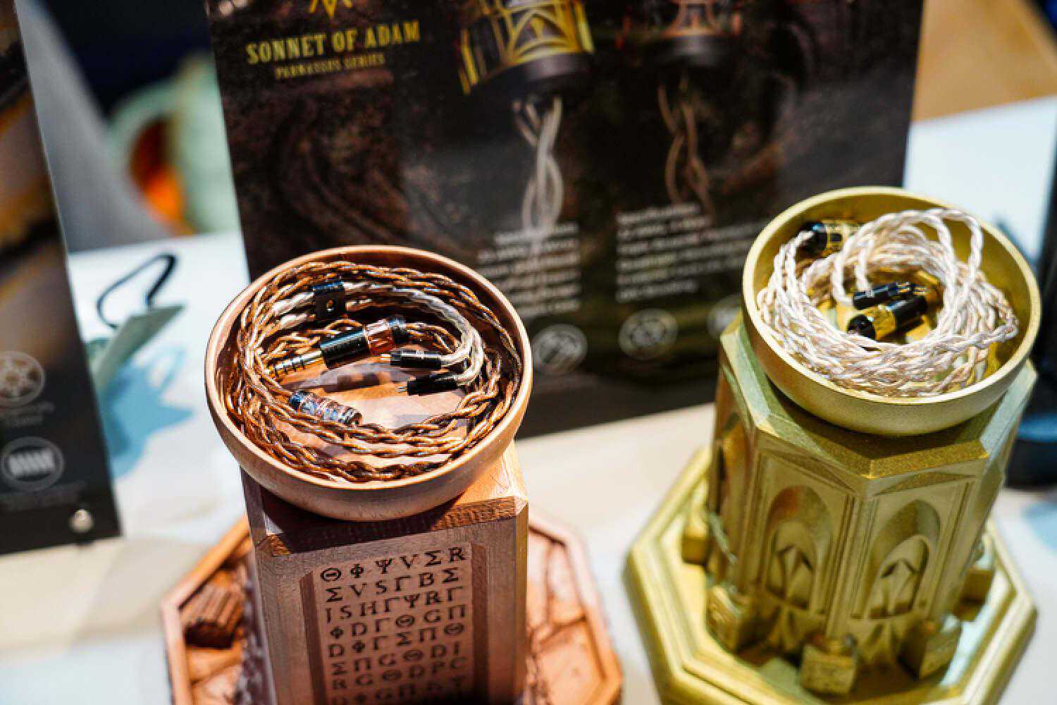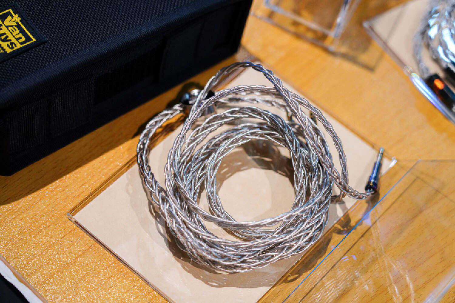 我乍一看还以为他们带了DHC的大耳线来参展,没想到是个2pin插针,给耳塞用的,佩戴十分的灾难,声音非常的好.这根线听起来会比常规的耳塞线明显密度高出一截来,结像硬朗而清晰,不是那种细而锐的清晰,而是蓬松的、丰厚的,音色比较中正大气,声场主要提升的是纵向,售价貌似是在两万的样子。