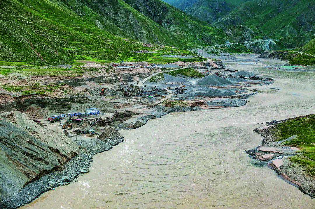 ◎在过去相当长的一段时间里,中国各地河流采砂缺乏统一有效的管理。河砂需求量大,采挖门槛低,获利却颇为丰厚,这使得诸多河湖饱受滥采盗采砂石的困扰和伤害。下图为长江上游的通天河,它上承沱沱河下接金沙江。在2012年前后,通天河采砂规模浩大,甚至蔓延到三江源保护区深处。图为当时通天河畔的挖砂场,堆积的砂石堵塞了大半河道。摄影/杨欣