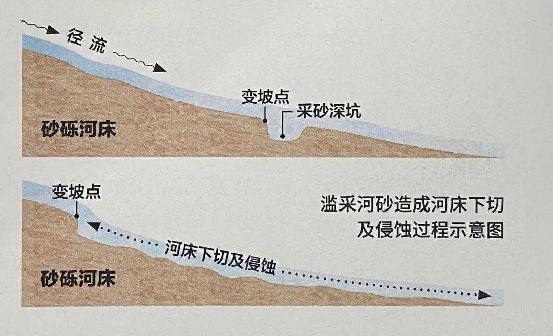 ◎挖砂造成河床下切的示意图,大量挖砂深坑造成径流溯源侵蚀并冲刷下游,使整个河段河床下降。绘图/张洵