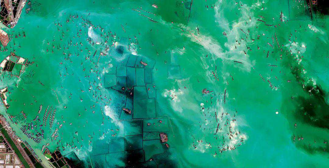 图为江苏骆马湖2015年秋的卫星图片,大批采砂船队让人想起赤壁之战中集结的战船,因大量盗挖滥采湖砂,骆马湖许多浅滩变为深水区,湖底呈荒漠化。下图为曾在江西赣江流域出现的大规模挖砂的情景。摄影/杨勇