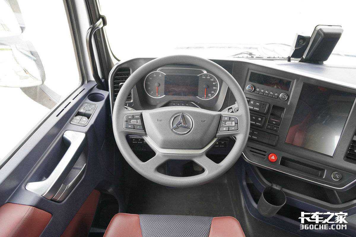 另外,得益于全车多处铝合金材料应用,例如铝合金油箱、铝合金储气筒、铝合金车轮等,整车自重控制在了8.5吨左右,对于一款拥有14.5升超过600马力发动机的牵引车而言,在自重方面表现十分出色,能够让卡友们多拉多赚。