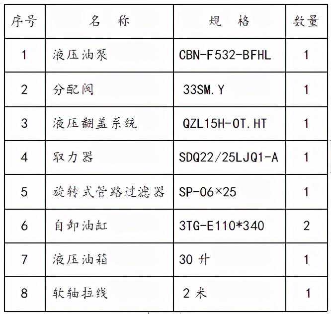 液压机构由取力器、齿轮油泵、分配阀、液压油缸、油路等组成,主要原理是通过汽车发动机带动油泵启动,齿轮油泵经吸油滤油器将液压油箱中的液压油吸入分配阀,液压油通过分配阀进入油缸下腔供油。