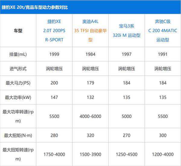 即便捷豹版本的确是全系最低级别配置的动力调教,然而无论是从驾乘体验还是官方数据,对比同级别竞争对手BBA三款竞争车型C200、320i、A4L的2.0T低配版本都是完胜。三款同为2.0T发动机的车型中动力数据最优的最大大功率135Kw,最大马力184PS,而捷豹XE达到了最大功率147Kw,扭矩340N·M,此等参数数据仅仅稍逊于竞品三车型的高功率配置版本。