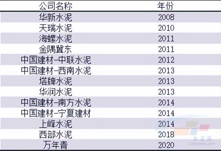 表1-1:部分水泥企业布局骨料业务的年份