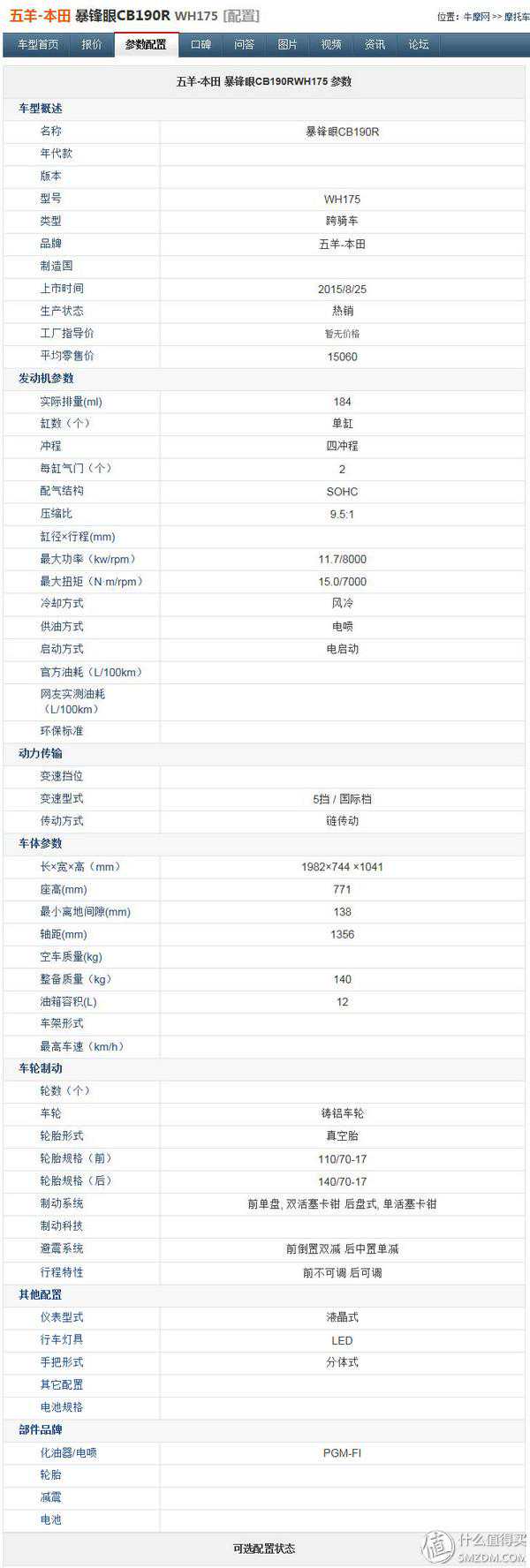 五羊本田CB190R的相关参数指标