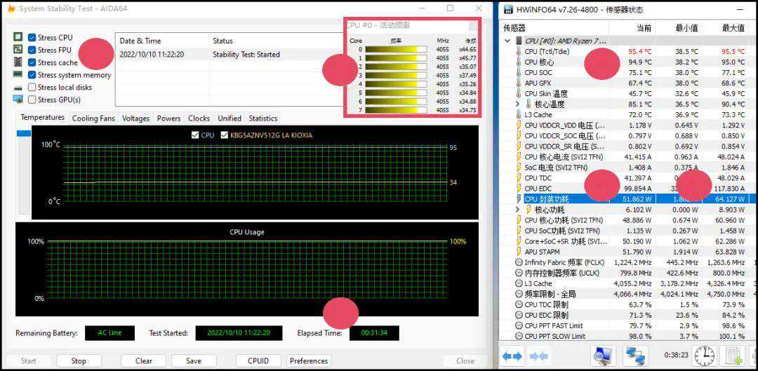 ▲锐龙R76800H款Neo14的处理器考机时爆发功率64W,但很快走低,第28秒就走低到52W,然后一直在52W~54W微幅波动,频率为稳定的全核4.05GHz,处理器内部温度在95℃左右保持稳定。