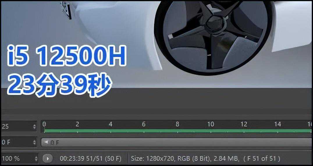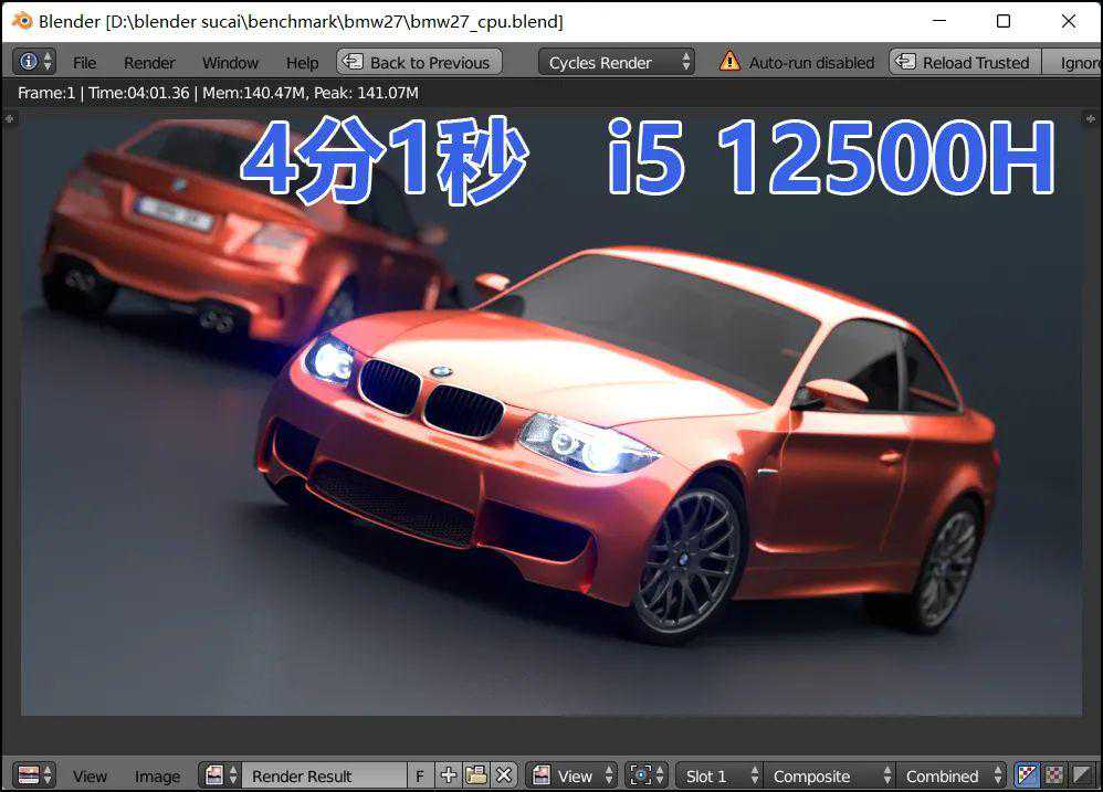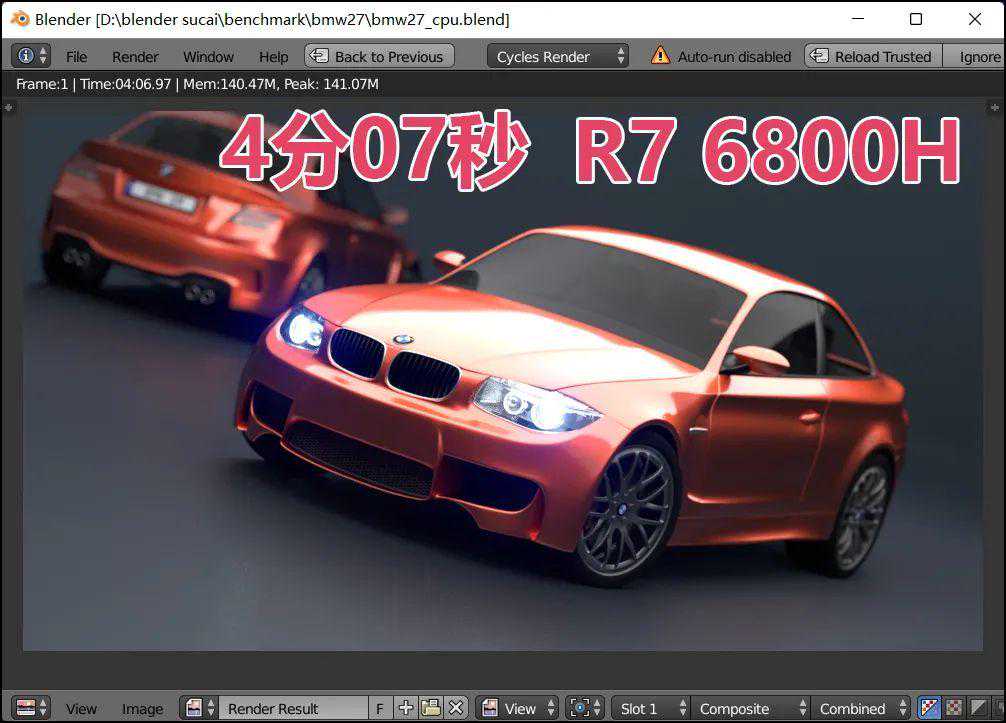 ▲BMW汽车样张,渲染耗时相对较短,i512500H耗时4分1秒,R76800H耗时4分7秒,酷睿平台微幅胜出。