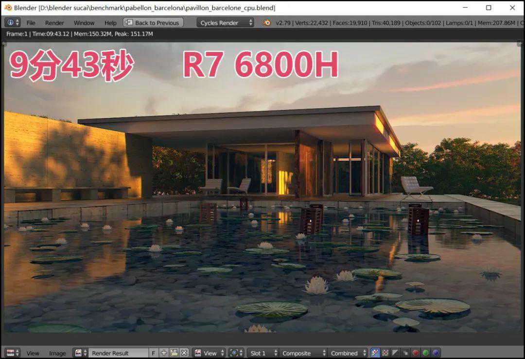 当然,三维渲染也不是只有Cinema4D这一款应用。下面我们更换了测试软件,采用Bler,它也是非常流行的建模和渲染软件,还可调用多种渲染引擎。这里我们依然采用CPU引擎,渲染官方提供的样张▼: