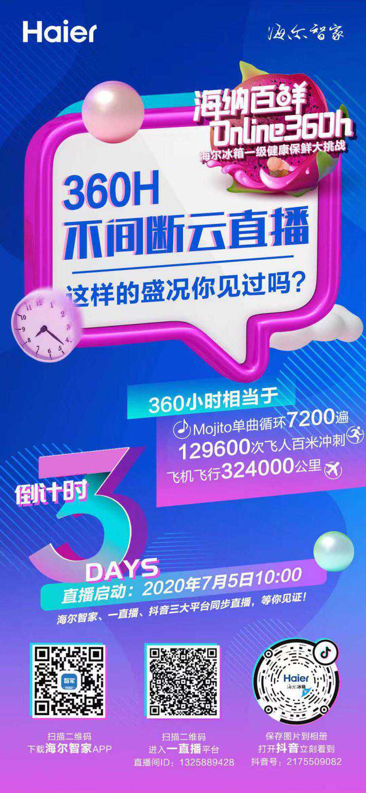7月5日上午10点,海尔全空间冰箱,海纳百"鲜"Online360H超长直播即将开启,通过为期15天不间断360小时线上直播,进行一级健康保鲜大挑战,让全民共鉴海尔全空间冰箱一级健康保鲜盛况。