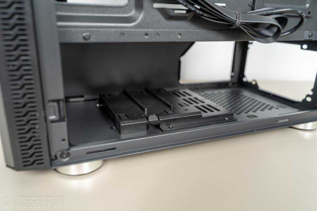 ▼并且电源仓内有一个塑料件,这个塑料件的右侧部分用于支撑机箱电源,左侧部分应该是用于固定机械硬盘,结构看起来比较复杂,配合配件,貌似支持硬盘快拆