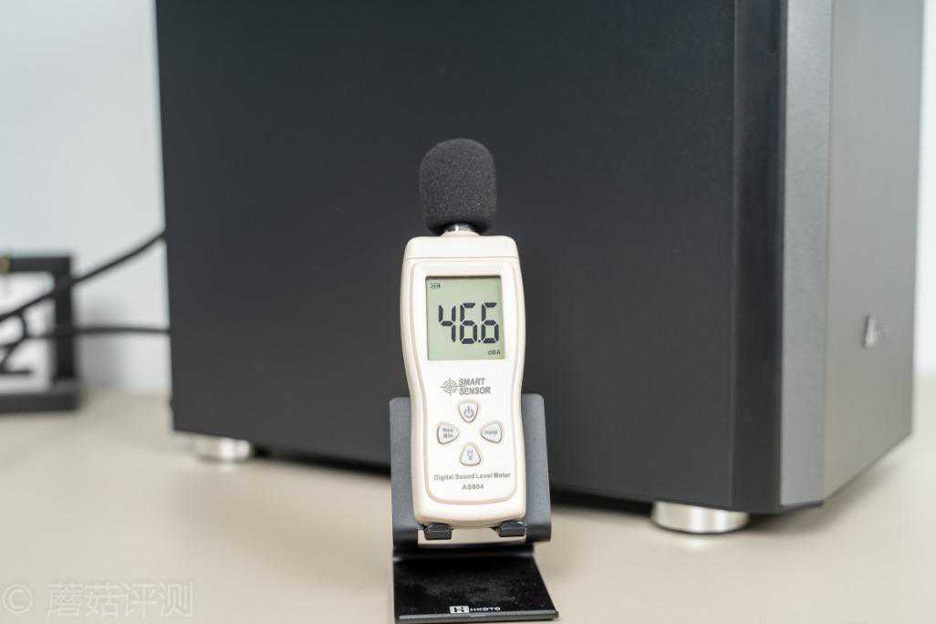 ▼开机之后,室内大约46.6dB,在搭载三把机箱风扇的情况下,开关机噪音增大不到10dB,这个静音机箱的表现还是可以的。如果想要更加安静,可以选择接电阻线或者不让机箱风扇转