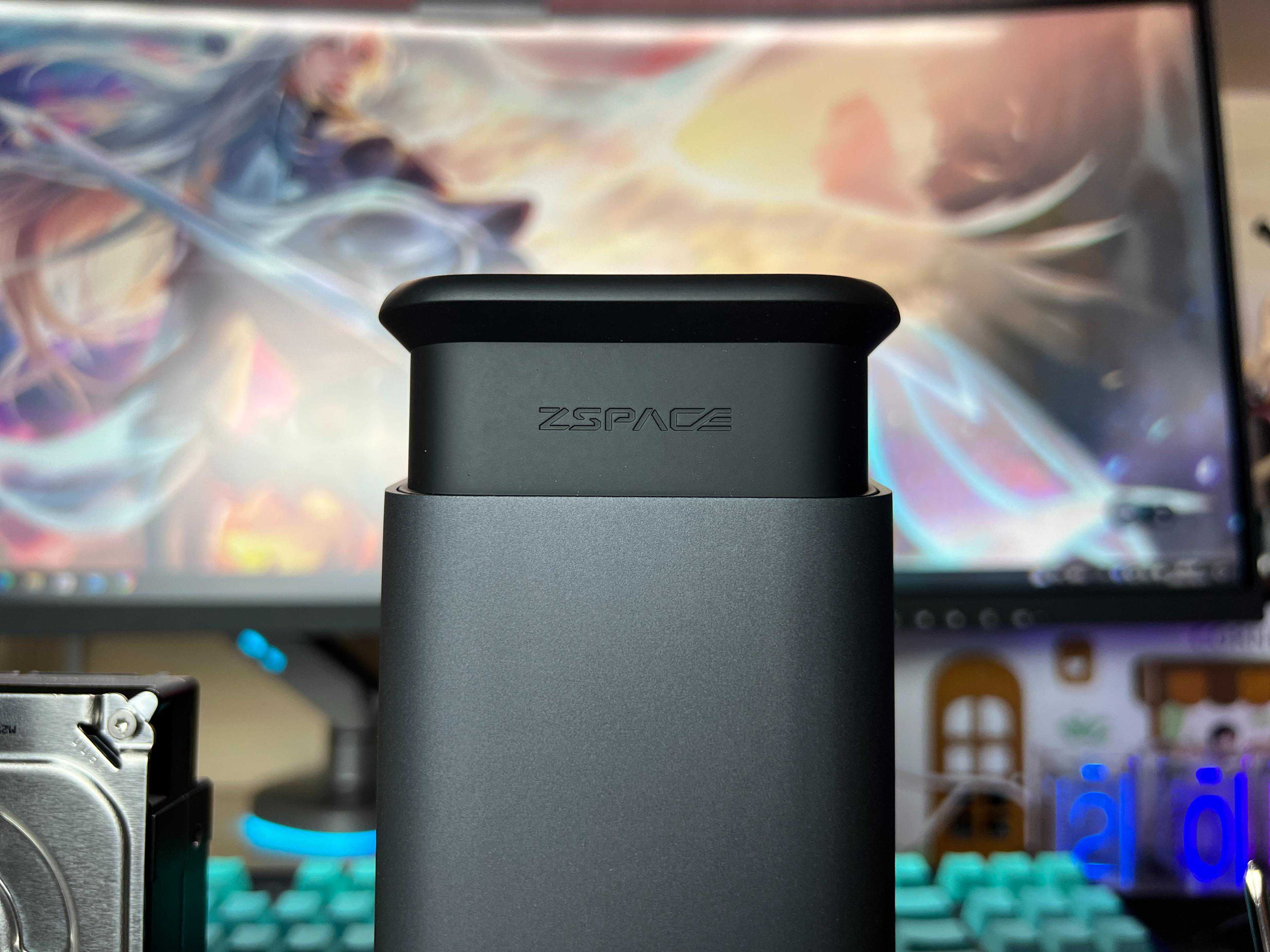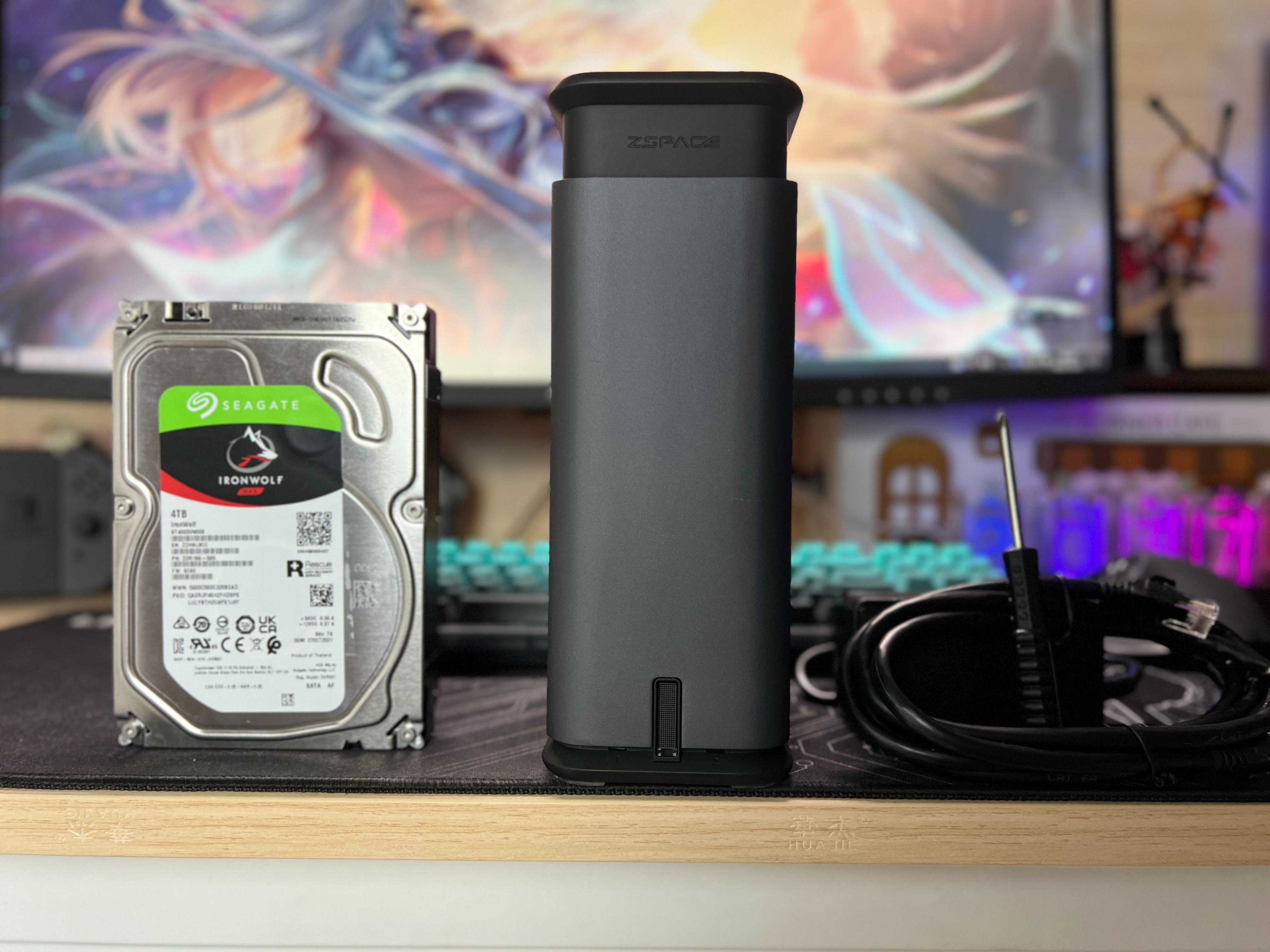 首先我们来看极空间Q2,这是极空间旗下最新的双盘位产品,于2022年8月份发布,在这三款产品中,发布时间最晚,整体起点高,Q2采用立式造型、超紧凑外观设计,铝合金外壳+多彩配色,拥有碳晶灰、静雅金、珍珠白三种配色,选择性高、可以根据家庭装修环境选择。我这款选择的是碳晶灰,铝合金的金属质感,碳晶灰的配色,在电竞风的书桌上,显得非常得酷,七彩的灯光,映射着无比迷人!立式瘦身设计,也是满满炫酷风!Q2的电源键在前面,平时开关机也方便,不需要摸到后面去找电源键!前置的三个灯光(硬件、两个硬盘等),可以很直观的查看设备和硬盘状态!毫不掩饰地说,这个颜值我是非常地喜欢!