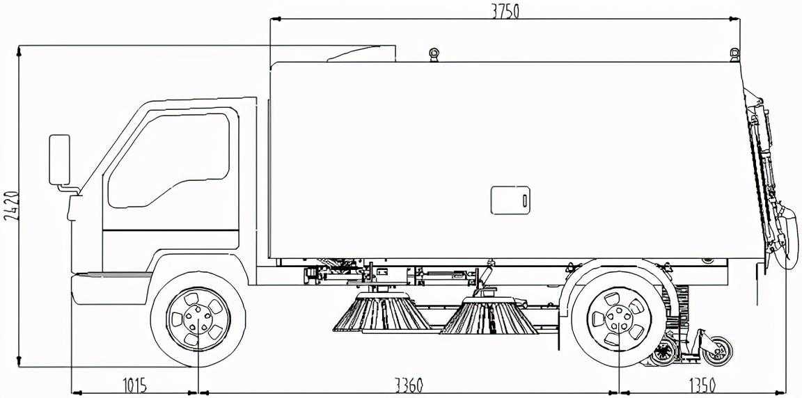 3、整车采用采用“中置四扫盘+后置吸嘴”布置形式,该形式具有清扫宽度大,清扫效率高的特点,并有利于清扫装置的调整和维护。