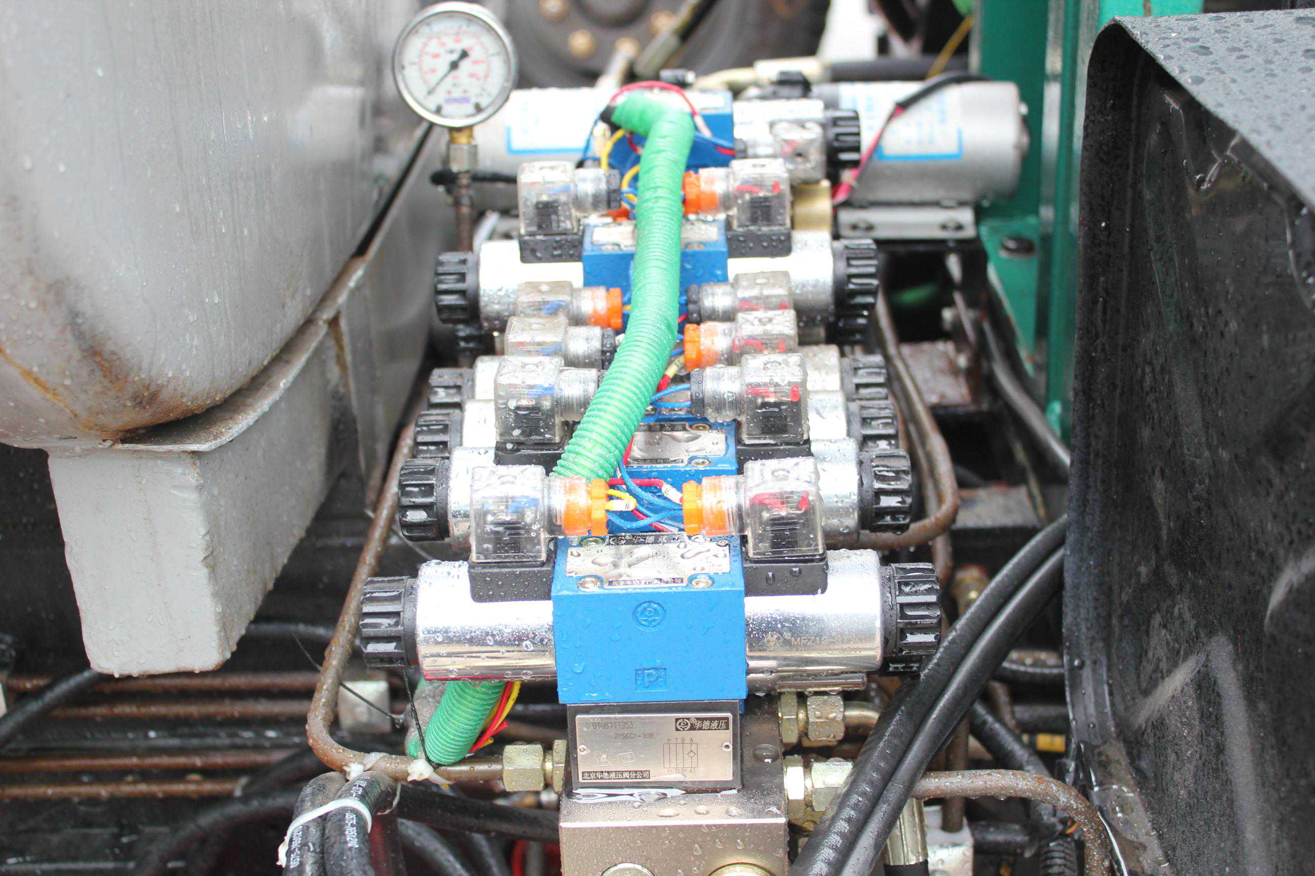 5060TSL型扫路车液压系统包括由副发动机驱动的齿轮油泵和手摇泵提供压力油驱动扫盘和其他动作。在正常工作状况下,副发动机工作时齿轮泵向阀块供油,通过电路和各种阀类的控制功能,分别控制左右扫盘提升油缸、左右扫盘马达、吸盘提升油缸、挡沙机构油缸、垃圾箱举升油缸、垃圾箱门油缸等各动作,扫盘转速也可由电磁阀控制功能实现高、中、低三种速度。当副发动机出现故障停止工作时,可以启动手摇泵向阀块供油,实现阀块控制的部分功能。在阀块上设有溢流阀,各油路的实际压力(只有在油缸工作到死点时)达到溢流阀的开启压力时,高压油通过溢流阀进入回油管路,防止油压过高损坏机械装置。合适的压力可以保证设备健康工作,节省能耗,溢流阀的开启压力是在机器调试时已经设定好,它保证了机器的正常工作,一般情况下,不得随便调整溢流阀压力,以免造成工作不正常或引起系统元件的损坏。在阀块中设有旁路节流阀,该节流阀设有三种节流面积,通过电磁阀换向,控制油路三种不同流速,从而有级地调节扫盘马达的转速,以适应于不同清扫工况。该节流阀在机器出厂时已经调好,出厂后不得随意调整。