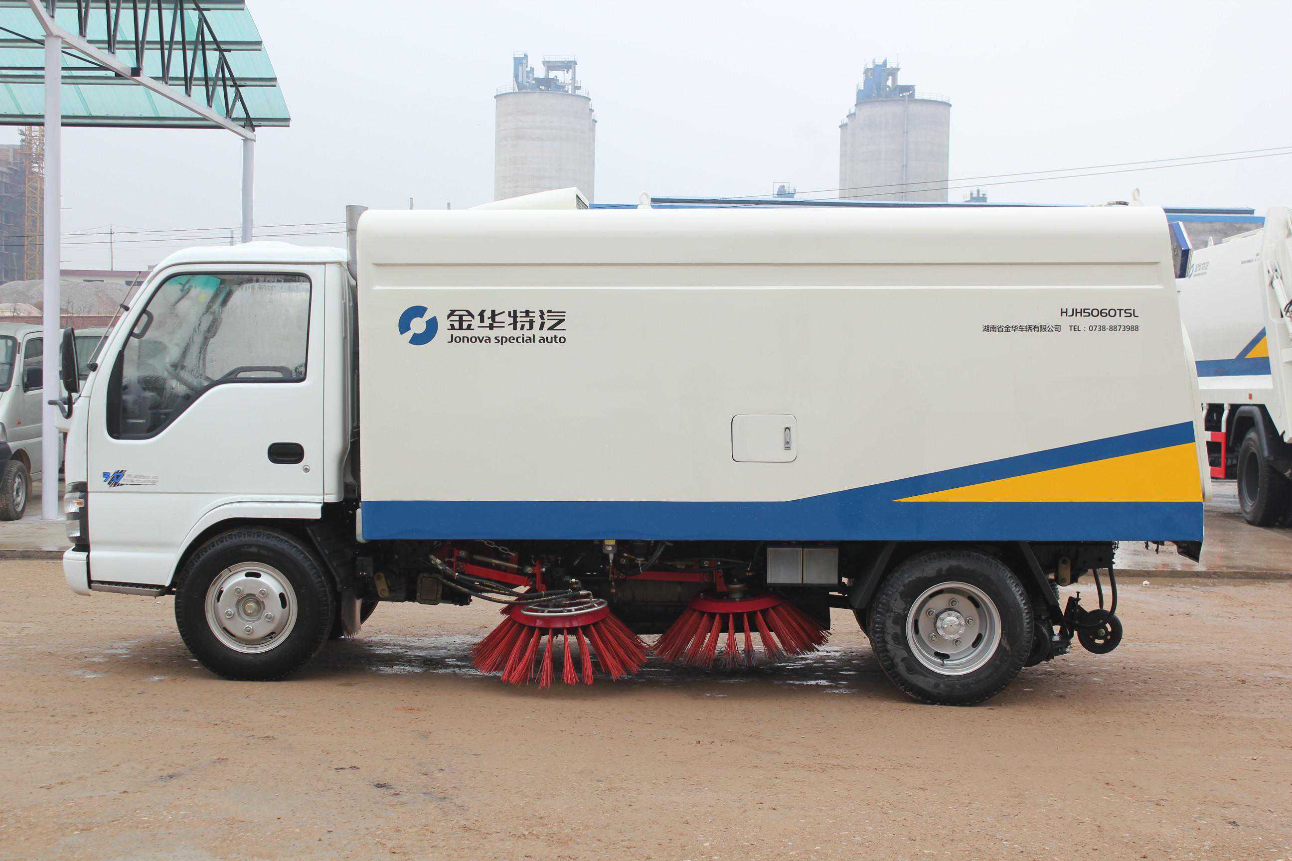 5060TSL扫路车采用二类汽车底盘改装,轴距3360mm,7.00-16轮胎,原装空调,加装动力系统、风机传动系统、洒水系统、液压系统、电气系统、清扫作业装置、副车架、垃圾箱等改装而成。其主要配套件:垃圾箱的倾翻、垃圾箱后门的开和关、扫盘的旋转、吸嘴的升降均采用液压传动,电、液集中控制;主要液压元件采用优质进口件,整机性能良好、可靠。该车采用以吸为主、吸扫结合、湿式除尘的工作原理对路面进行清扫作业,具有清扫效率高,二次污染小,维修方便快捷等特点,是城市道路、高速公路、机场、码头等地面理想的清扫、保洁作业设备,是一款一机多用的设备。