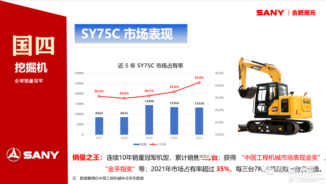 销量之王——SY75C:连续10年销量冠军机型,累计销售8万台;获得“中国工程机械市场表现金奖”、“金手指奖”等;2021年市场占有率超过35%,每三台7吨挖机就有一台三一造。