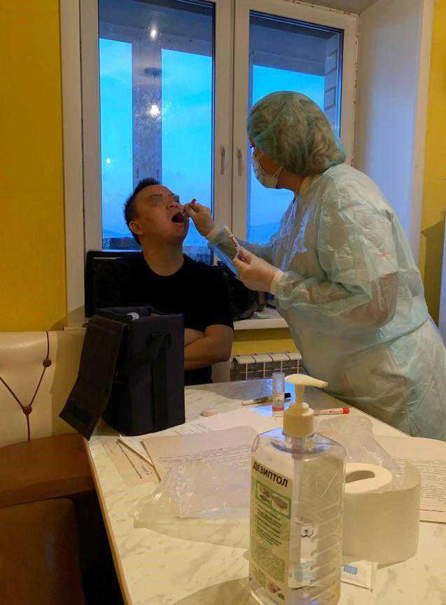 据万先生描述,医生上门来询问情况并抽血,口腔和鼻腔采样用来检测,后开了点感冒药就走了。第二天一早,医生又来了,把他们一家被急救车拉到医院,再次抽血采样要送到莫斯科检查是否是新冠肺炎,然后让他们回家等待检测结果,还让他们去药店买了雾化器和一些常见感冒药。当天晚上,万先生的咳嗽加重,女儿也开始拉肚子和发烧。