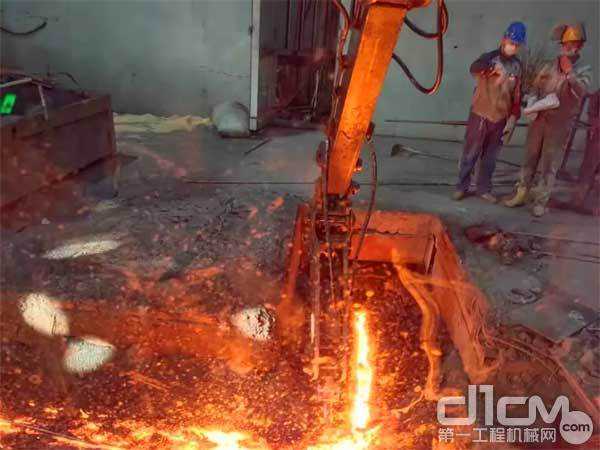 钢炉前温度更高,距离3米的温度计都显示有80℃,挖机三大件就如同放在“火上烤”。真金不怕火炼,这么高的温度,“设备能干不能干,一目了然,造不了假”。