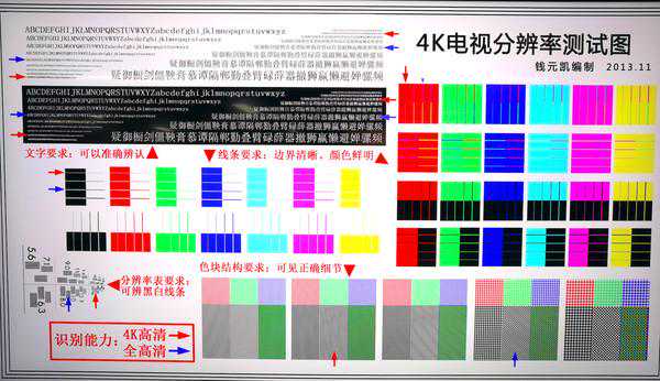 在这张4K标准测试图中,小米电视大师86英寸MiniLED所呈现的效果,能够让我们清晰地分辨红色箭头对应的文字、线条和图案。即便是最细小的一行也能够清晰地显示出来,在4K电视中达到了顶尖水准。测试图中的下方箭头指向的小方格,也能够得到准确地显示,保证其可以输出完美4K清晰度的精彩画面。