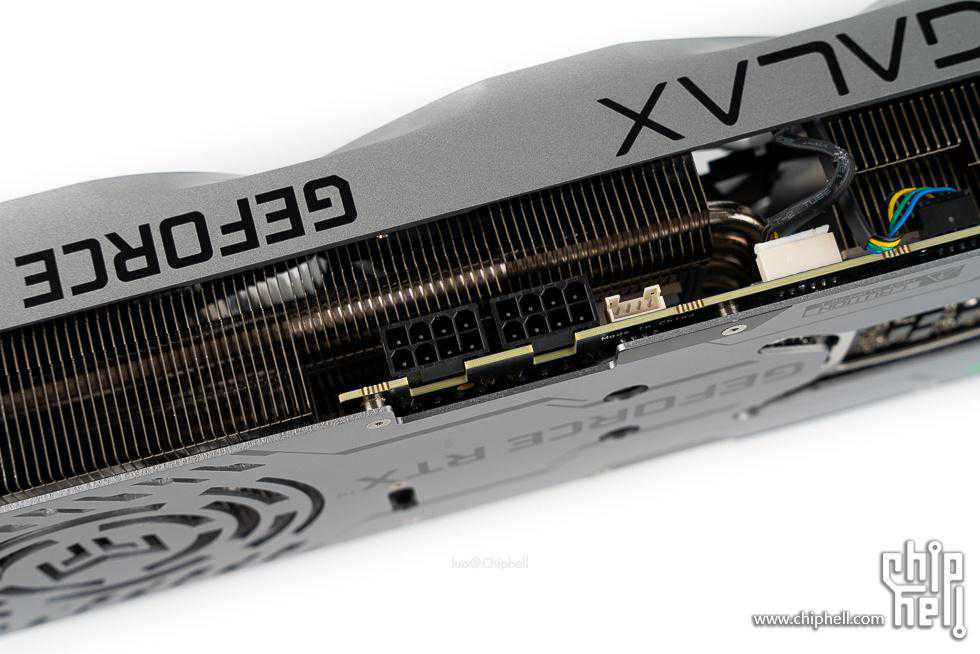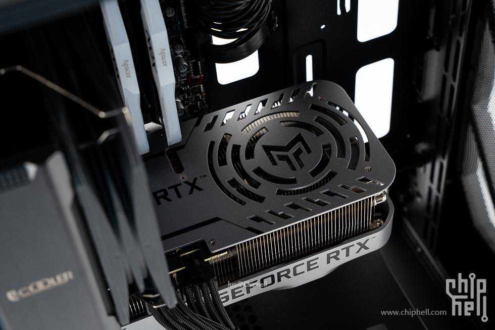 显卡金属背板,上面印有GeforceRTX字样,前部有贯穿风道设计。