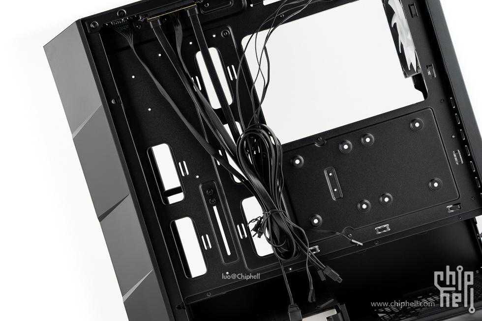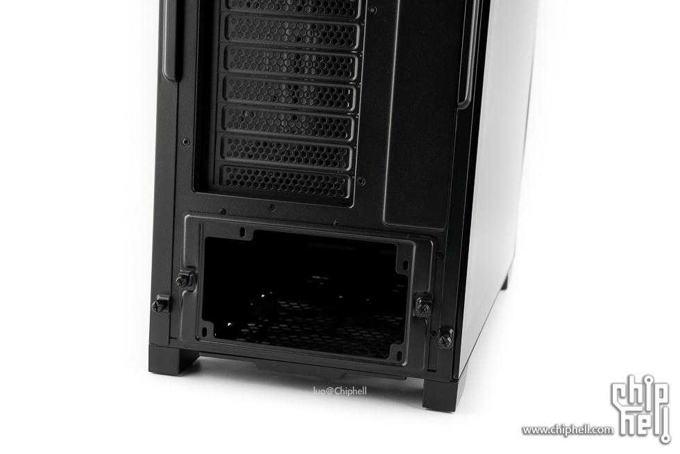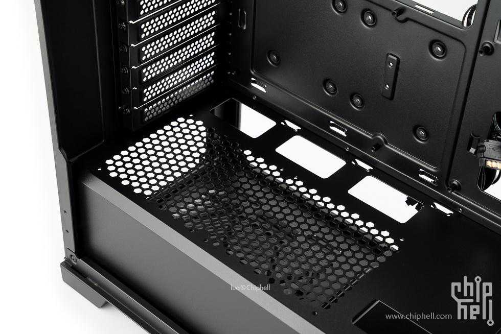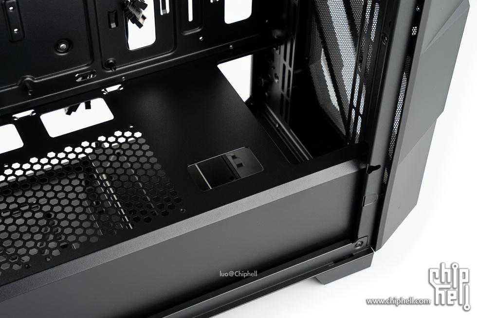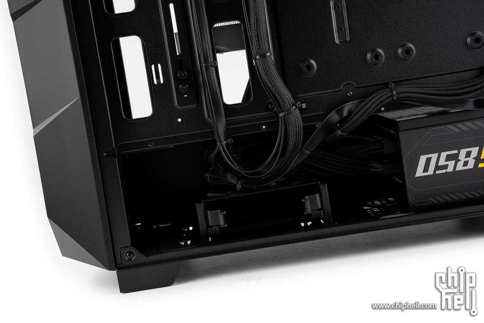 底部,支持1个3.5寸和2个2.5寸硬盘安装,电源最长支持到205mm,拆除3.5寸硬盘安装架后,支持最长410mm的电源。