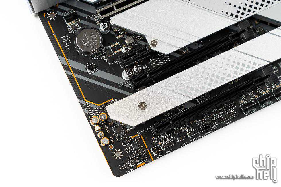 主板下方部分覆盖了大面积的散热装甲,第一条为插槽,由CPU提供,包边加固设计,其下两条为全长,由Z690芯片组提供。