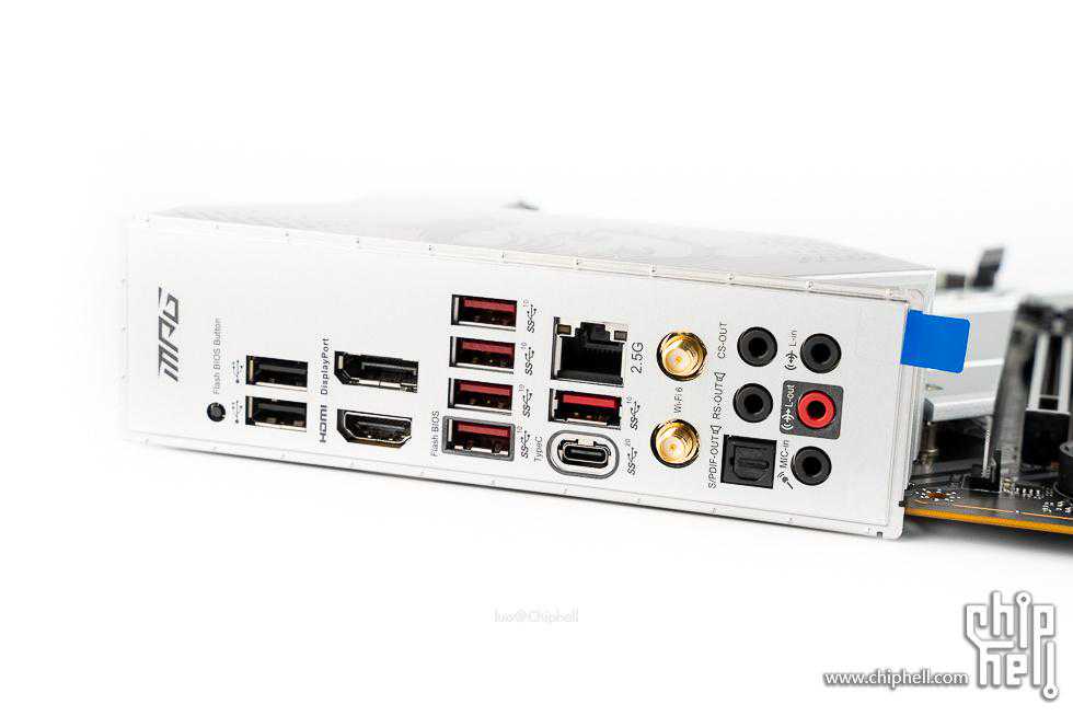 主板后方I/O挡板的颜色为白色,与正面装甲保持一致。接口包括FlashBIOS按钮、2个、HDMI、DisplayPort、6个(其中1个为Type-C型)、1个2.5GbLAN有限网口、WiFi天线连接端、5个3.5mm音频输出和1个S/PDIF光纤输出。