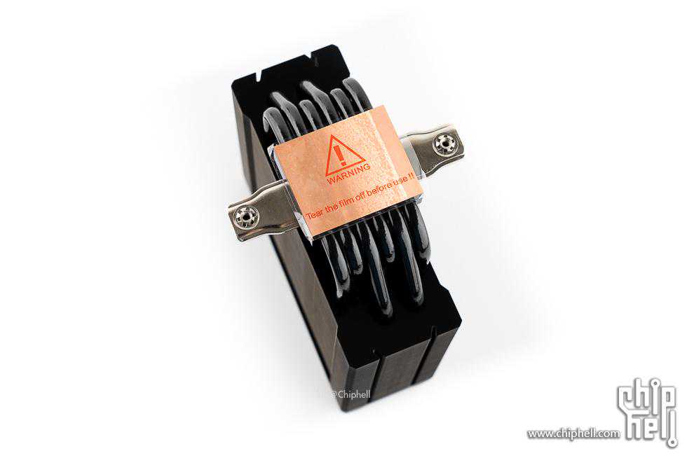 散热器底部,可以看到6根热管,并且使用了纯铜底座,贴有保护膜,使用前需要撕掉。