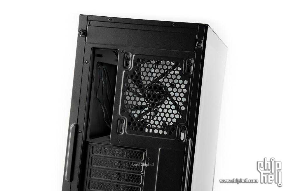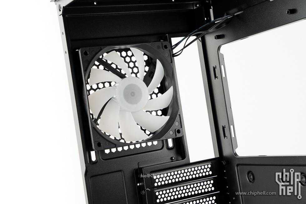 机箱尾部,上方为后置12cm风扇位,预装了一把支持ARGB的12cm风扇。