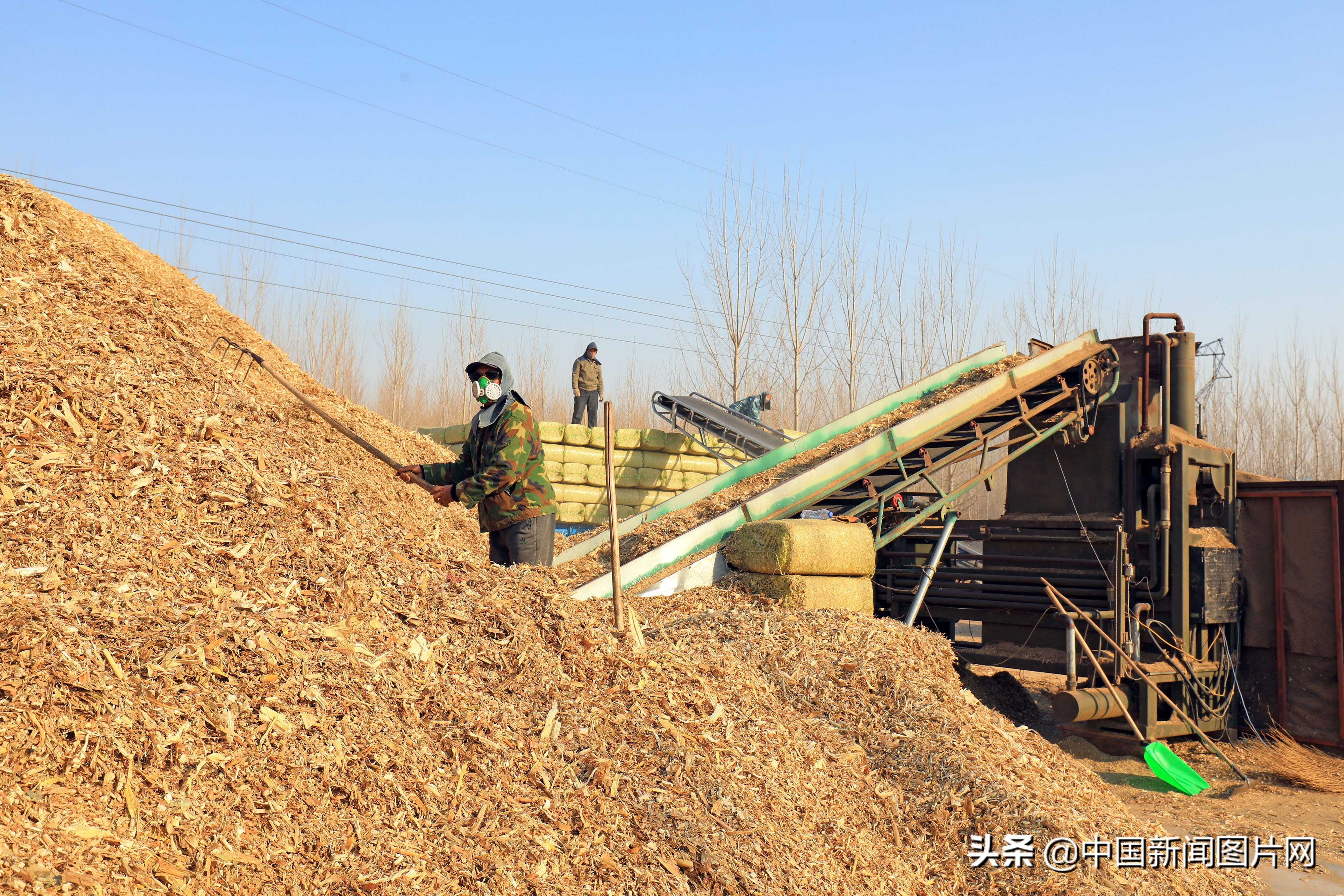 2020年3月20日,工人在河北省唐山市滦南县倴城镇皂户村一个秸秆压块场地里忙碌。中新社发张永新摄