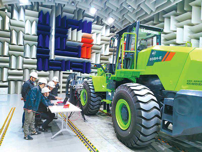 柳工全球研发中心半消声实验室内,一台电动装载机在进行噪声检测。(广西柳工机械股份有限公司供图)