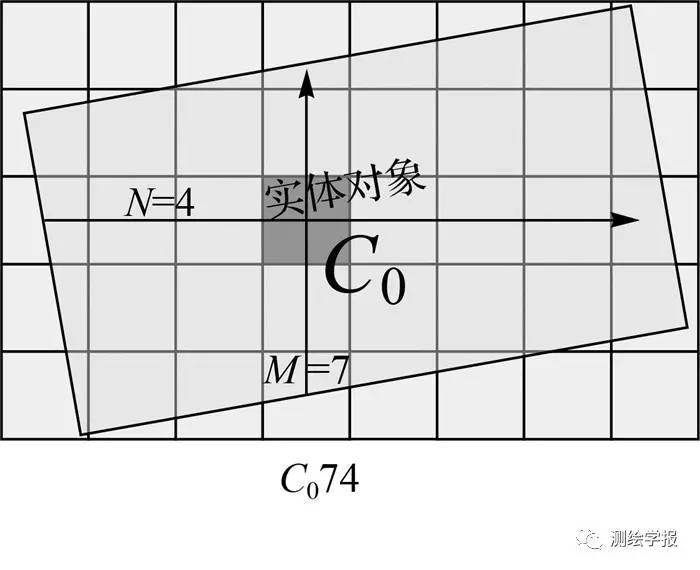 编码所标识的区域不仅仅是单一的网格区域,而是可以由多个网格所构成的组合区域。其实现思想是采用定位网格码+跨度码的方式组成,区域网格编码由中心的定位网格码C0加上两个方向上网格的跨度码M、N形成,当M=N=0时,表示为定位网格本身,区域组织示例如图2所示。
