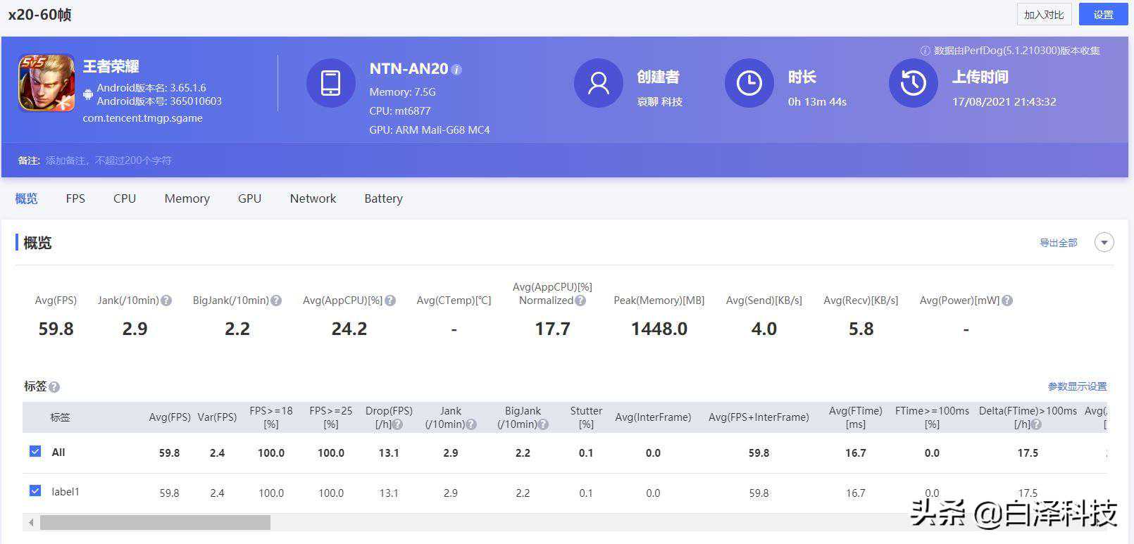 画质和模式选择是高帧率(60FPS)+高分辨率+高清模式,游戏进行13分钟。实测平均帧率为59.8FPS,波动很小,即便在中段的团控对战,整体表现还是很不错的,CPU和GPU的运用率都相对较低。