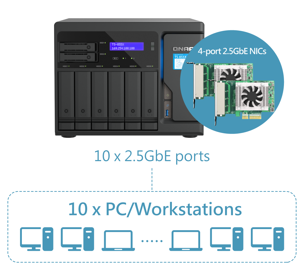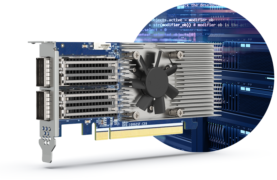 它还配备双2.5GbE和单10GbE网口,其中双2.5GbE端口还支持高达5Gbps的SMB多通道技术。值得一提的是,它还提供了两个PCIeGen3插槽,可以通过安装兼容的PCIe卡拓展5/10/25GbE网卡、QM2卡或光纤卡。