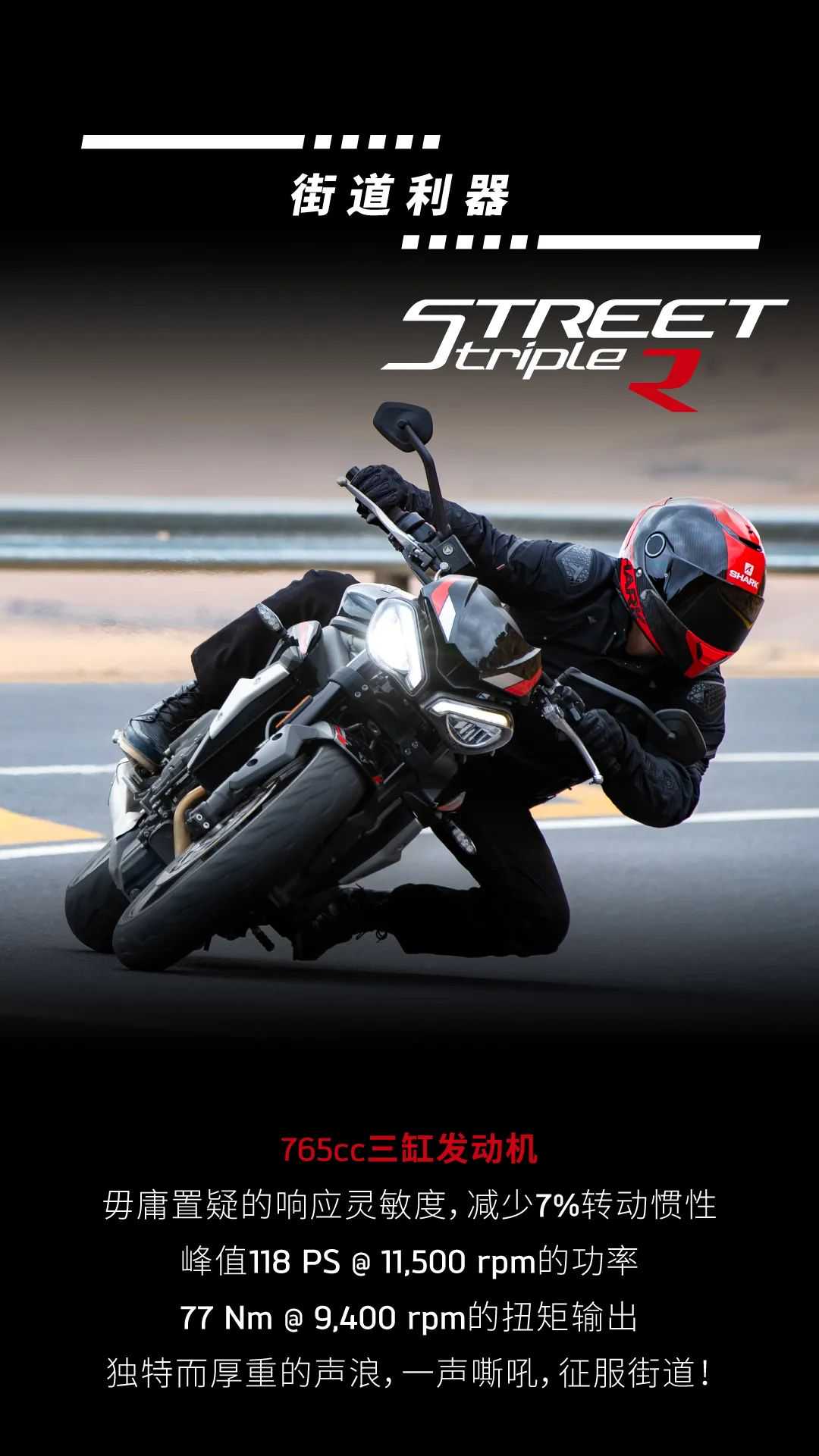 凯旋声称此次在进排气部分也进行了调整,让StreetTripleR的三缸声浪更加浑厚。StreetTripleR在变速箱部分继承了RS版本所做的升级,缩减了前两级的传动比,使其在挡位衔接和骑乘时更加顺畅。另外StreetTripleR还配备了滑动离合器,提升换挡的舒适性和安全性。
