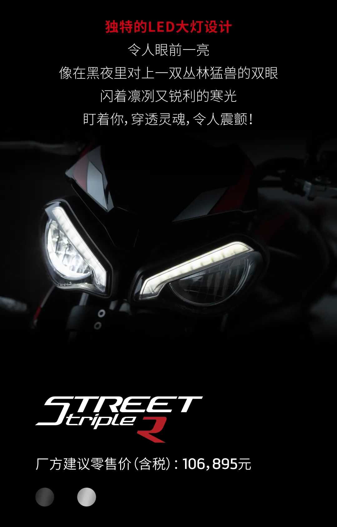 新款StreetTripleR在2020年初获得更新后,换装了全新的家族化外观,更加凶猛锐利,在配置和电控方面也有着重大升级。StreetTripleR在外观造型上与RS版基本保持一致,新的外观设计更加运动,没有了上一代呆萌的大眼睛,取而代之的是将青蛙眼扁平化处理,上方搭配两道LED灯眉,营造出一种非常凶猛的感觉。配上全车的肌肉线条,独特的造型无论走到哪里都会是路上的焦点。